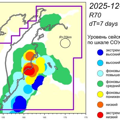 Уровень сейсмичности Камчатского участка зоны субдукции (по состоянию на 31 декабря 2025 г.) – фоновый средний по шкале СОУС'09. (http://emsd.ru/files/ku/ViS2011-SOUS.pdf).