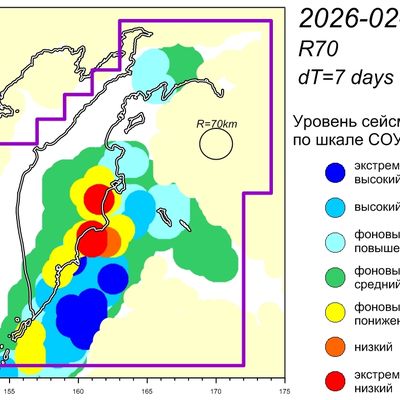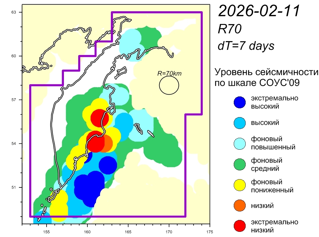 Уровень сейсмичности Камчатского участка зоны субдукции (по состоянию на 11 февраля 2026 г.) – фоновый повышенный по шкале СОУС'09. (http://emsd.ru/files/ku/ViS2011-SOUS.pdf).