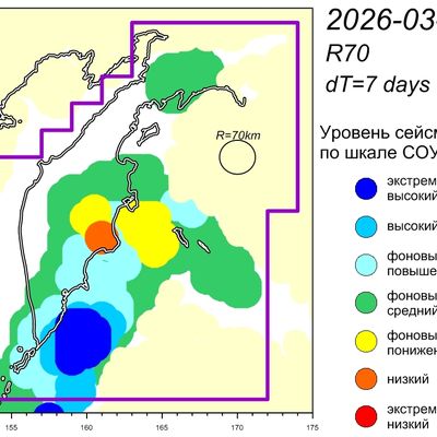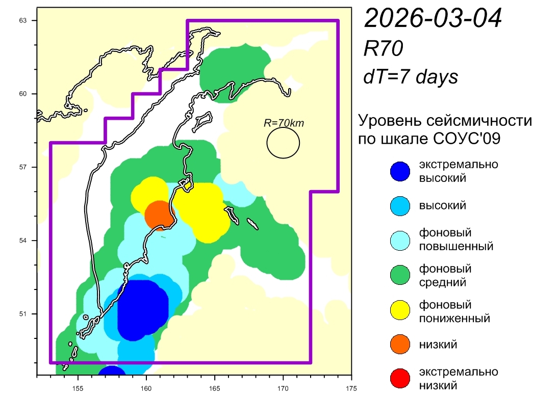 Уровень сейсмичности Камчатского участка зоны субдукции (по состоянию на 04 марта 2026 г.) – фоновый повышенный по шкале СОУС'09. (http://emsd.ru/files/ku/ViS2011-SOUS.pdf).