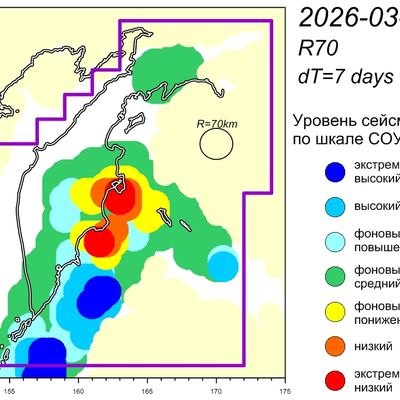 Уровень сейсмичности Камчатского участка зоны субдукции (по состоянию на 25 марта 2026 г.) – фоновый повышенный по шкале СОУС'09. (http://emsd.ru/files/ku/ViS2011-SOUS.pdf).