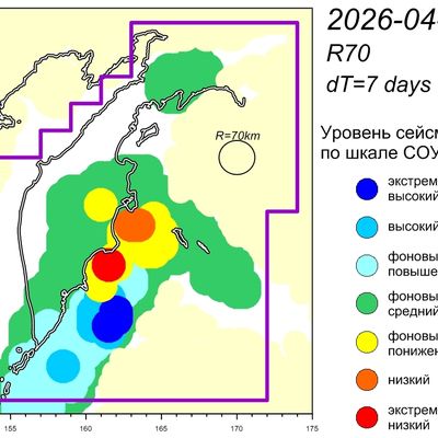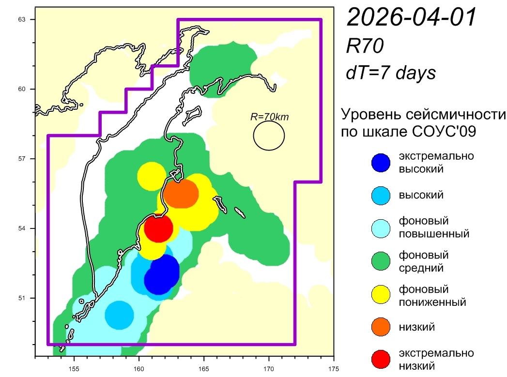 Уровень сейсмичности Камчатского участка зоны субдукции (по состоянию на 01 апреля 2026 г.) – фоновый средний по шкале СОУС'09. (http://emsd.ru/files/ku/ViS2011-SOUS.pdf).