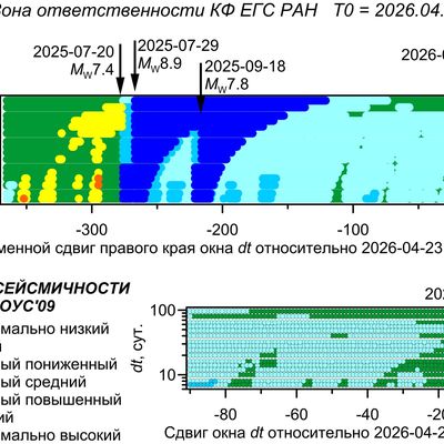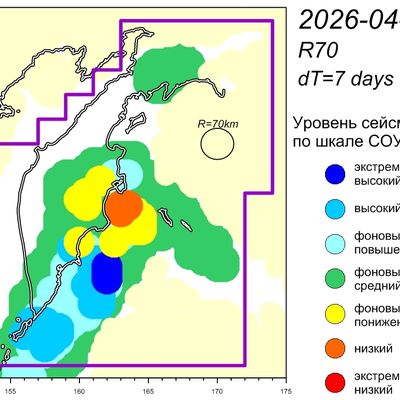 Уровень сейсмичности Камчатского участка зоны субдукции (по состоянию на 22 апреля 2026 г.) – фоновый средний по шкале СОУС'09. (http://emsd.ru/files/ku/ViS2011-SOUS.pdf).